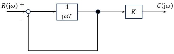 図に示すように,フィードバック接続を含んだブロック線図がある。このブロック線図において,\( \ T=0.2 \ \mathrm {s} \ \),\( \ K=10 \ \)としたとき,次の(a)及び(b)の問に答えよ。