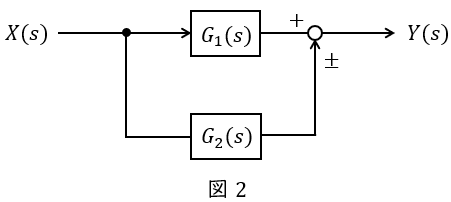 図2のような伝達関数\( \ G_{1}(s) \ \),\( \ G_{2}(s) \ \)が与えられているとき,全体の伝達関数\( \ G(s) \ \)は,