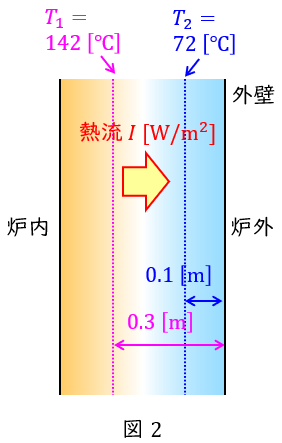 となるので,単位面積当たりの熱損失(熱流)\( \ I \ \mathrm {[W / m^{2} ]} \ \)は,ワンポイント解説「1.熱伝導」の通り,