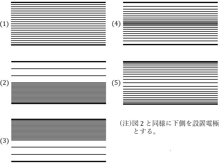 図1に示すような,空気中における固定誘電体を含む複合誘電体平行平板電極がある。この下部電極を接地し,上部電極に電圧を加えたときの電極間の等電位線の分布を示す断面図として,正しいのは次のうちどれか。