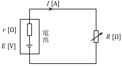 であり,\( \ R=2.25 \ \mathrm {[\Omega ]} \ \)のとき\( \ I=3 \ \mathrm {[A]} \ \),\( \ R=3.45 \ \mathrm {[\Omega ]} \ \)のとき\( \ I=2 \ \mathrm {[A]} \ \)であるから,