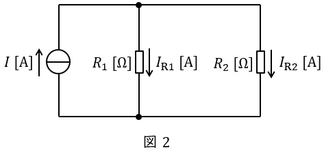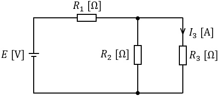 となる。これより,\( \ R_{3} \ \mathrm {[\Omega ]} \ \)に流れる電流\( \ I_{3} \ \mathrm {[A]} \ \)は,ワンポイント解説「2.分圧・分流の法則」の通り,
