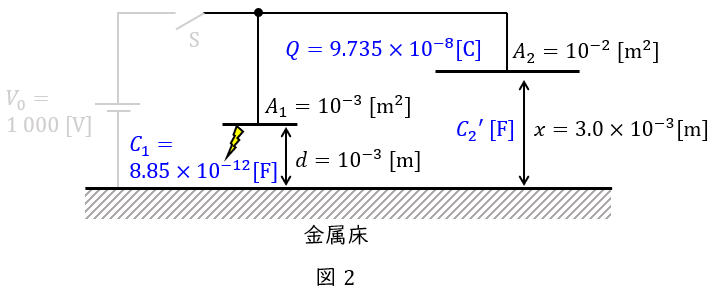 図2のように,\( \ x=3.0\times 10^{-3} \ \mathrm {[m]} \ \)とした時の静電容量\( \ C_{2}^{\prime } \ \mathrm {[F]} \ \)は,