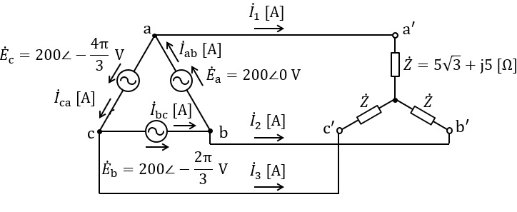 \( \ \mathrm {\Delta } \ \)結線の電源と\( \ \mathrm {Y} \ \)結線の負荷を組み合わせた三相回路に関する問題です。