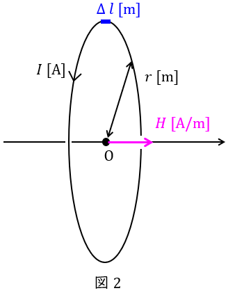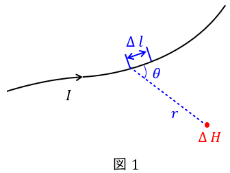 図1に示すように,微小な長さ\( \ \Delta l \ \mathrm {[m]} \ \)に流れる電流\( \ I \ \mathrm {[A]} \ \)が,距離\( \ r \ \mathrm {[m]} \ \)離れた場所に作る磁界\( \ \Delta H \ \mathrm {[A / m]} \ \)は,