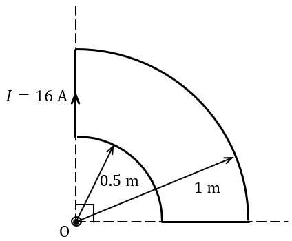 図のように,点\( \ \mathrm {O} \ \)を中心とするそれぞれ半径\( \ 0.5 \ \mathrm {m} \ \)と半径\( \ 1 \ \mathrm {m} \ \)の円形導線の\( \ \displaystyle \frac {1}{4} \ \)と,それらを連結する直線状の導線からなる扇形導線がある。この導線に,図に示す向きに直流電流\( \ I=16 \ \mathrm {A} \ \)を流した場合,点\( \ \mathrm {O} \ \)における磁界の大きさ\( \ H \ \)の値\( \ \mathrm {[A / m]} \ \)として,最も近いものを次の(1)~(5)のうちから一つ選べ。