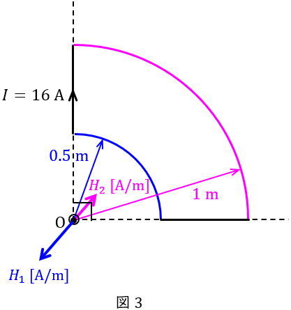 それぞれの大きさ\( \ H_{1} \ \mathrm {[A / m]} \ \)及び\( \ H_{2} \ \mathrm {[A / m]} \ \)は,ワンポイント解説「2.円形コイルが中心点に作る磁界の大きさ」の通り,