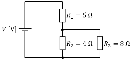 \] であるから,それぞれの抵抗\( \ R_{\mathrm {1}}=5 \ \mathrm {[\Omega ]} \ \),\( \ R_{\mathrm {2}}=4 \ \mathrm {[\Omega ]} \ \),\( \ R_{\mathrm {3}}=8 \ \mathrm {[\Omega ]} \ \)に加わる電圧\( \ V_{\mathrm {1}} \ \mathrm {[V]} \ \),\( \ V_{\mathrm {2}} \ \mathrm {[V]} \ \),\( \ V_{\mathrm {3}} \ \mathrm {[V]} \ \)は,分圧の法則より,