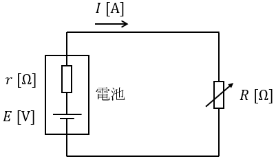 図のように,内部抵抗\( \ r \ \mathrm {[\Omega ]} \ \),起電力\( \ E \ \mathrm {[V]} \ \)の電池に抵抗値\( \ R \ \mathrm {[\Omega ]} \ \)の可変抵抗器を接続した回路がある。\( \ R=2.25 \ \mathrm {\Omega } \ \)にしたとき,回路を流れる電流は\( \ I=3 \ \mathrm {A} \ \)であった。次に,\( \ R=3.45 \ \mathrm {\Omega } \ \)にしたとき,回路を流れる電流は\( \ I=2 \ \mathrm {A} \ \)となった。この電池の起電力\( \ E \ \mathrm {[V]} \ \)の値として,最も近いものを次の(1)~(5)のうちから一つ選べ。